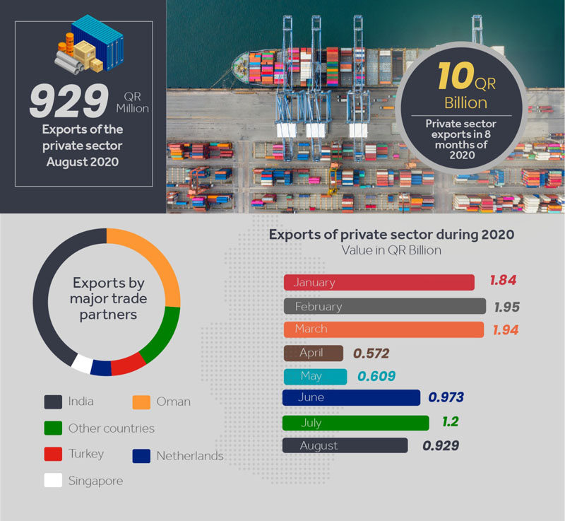 In August 2020, India was at the top of the countries of destination of private sectors exports with close to QR 299mn, a share of 32.1 percent of the total exports. It was followed by Oman with almost QR 173mn and a share of 18.6 percent, Turkey with about QR 94mn, a share of 10.1 percent.