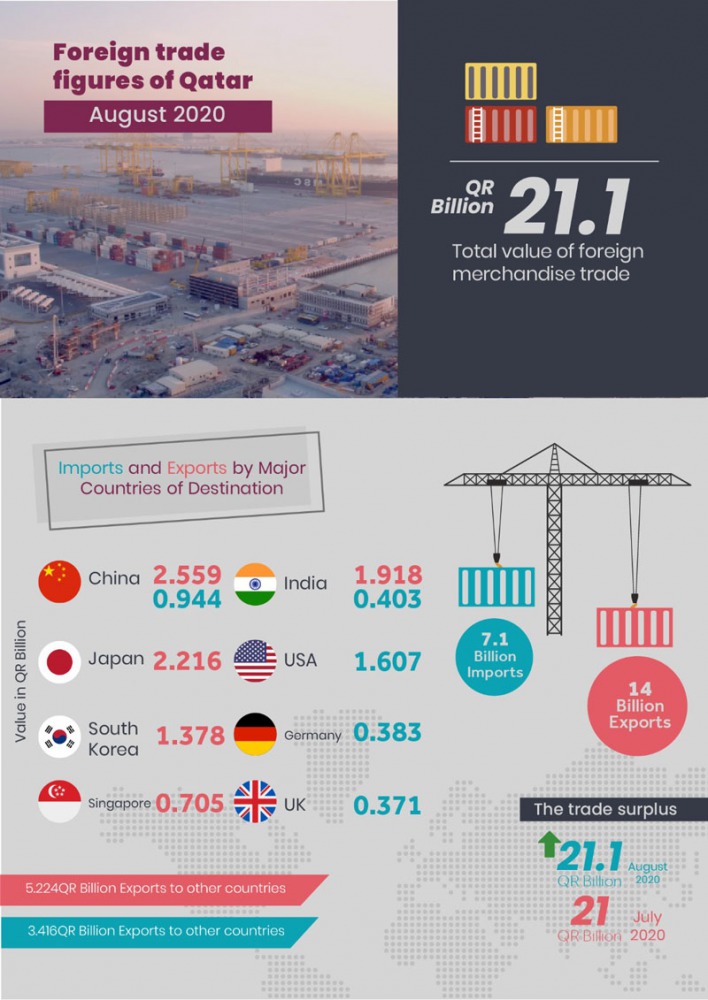 In August 2020, the total exports of goods (including exports of goods of domestic origin and re-exports) amounted to around QR 14 billion, showing an increase of 2.9 percent compared to QR 13.6 billion in July, while imports during the same month amounted to around QR 7.1 billion, showing a decrease of 4.1 percent compared to QR 7.4 billion in July.