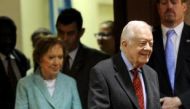 Former U.S. President Jimmy Carter is followed by his wife Rosalynn as he arrives for a news conference to discuss his recent cancer...