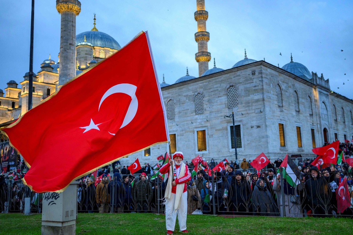A man waves a Turkish flag as people demonstrate in solidarity with the Palestinian people at the Galata Bridge in Istanbul on January 1, 2026. (Photo by Yasin AKGUL / AFP)