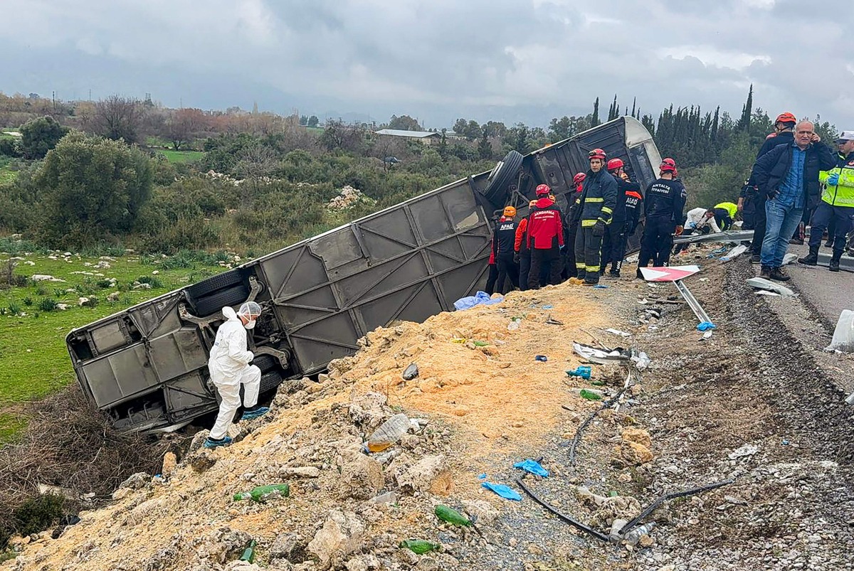This handout photograph taken and released on February 1, 2026 by Turkish news agency DHA (Demiroren News Agency) shows first aid officials working at the site of a Bus accident in Antalya. Photo by HANDOUT / DHA (Demiroren News Agency) / AFP