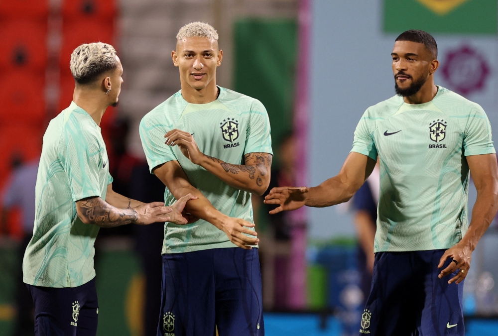 Brazil's Richarlison, Antony and Bremer during training at the Al Arabi SC Stadium, Doha, Qatar, on December 1, 2022. REUTERS/Amanda Perobelli