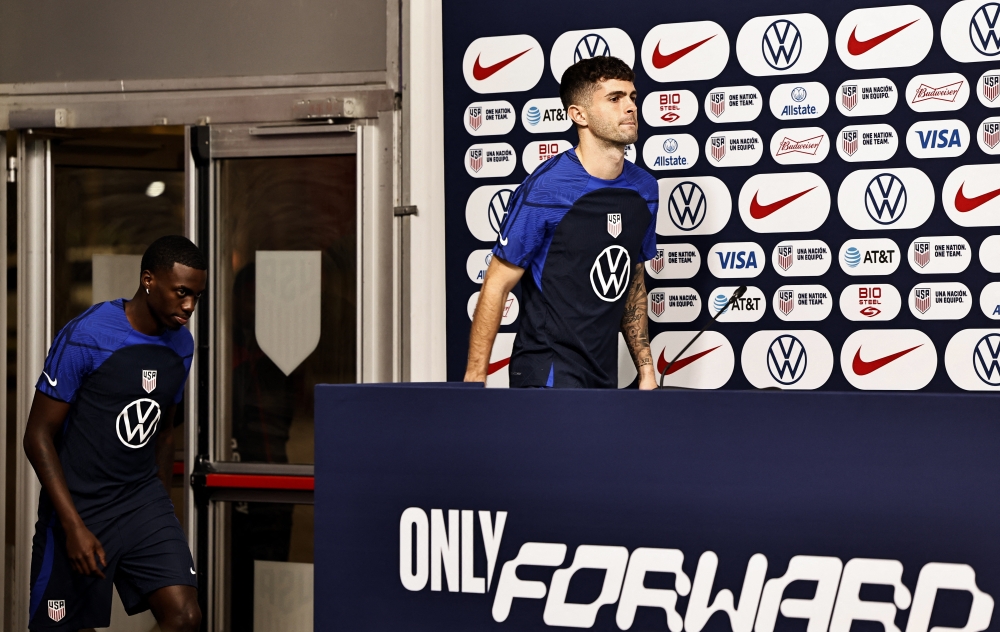 Timothy Weah and Christian Pulisic of the US arrive for a press conference at the Al Gharafa SC Stadium, Al Rayyan, Qatar, on December 1, 2022. REUTERS/Hamad I Mohammed