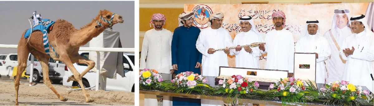 Action from the Hejen festival at Al Shahaniya Camel Racetrack. RIGHT: The podium winners at Hejen festival during the victory ceremony. The festival was organised by Camel Racing Organizing Committee of Qatar. The festival is one of the most prominent in the GCC region in terms of organisation and prize money. An unprecedented number of participants from Qatar and from other GCC regions took part in the festival.