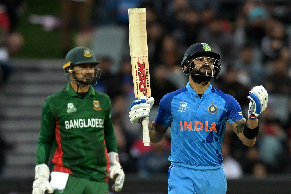 India's Virat Kohli gestures after a shot for four runs during the ICC men's Twenty20 World Cup 2022 cricket match between India and Bangladesh at Adelaide Oval on November 2, 2022 in Adelaide. Photo by Brenton Edwards / AFP