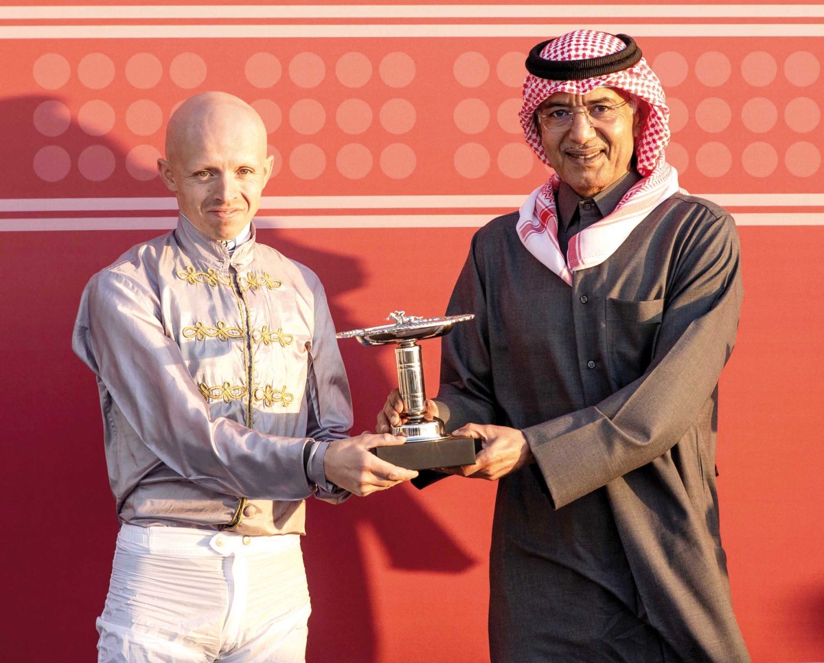 H H Sheikh Abdullah bin Khalifa Al Thani presents a trophy to jockey Olivier d’Andigne after Al Wakrah's triumph.