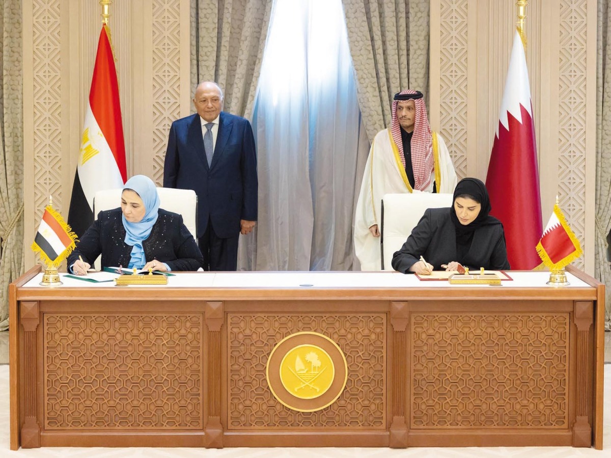 Prime Minister and Minister of Foreign Affairs H E Sheikh Mohammed bin Abdulrahman bin Jassim Al Thani and Egyptian Foreign Minister H E Sameh Shoukry sign a document on the occasion of 5th session of Qatar-Egypt Joint Supreme Committee in Doha yesterday.