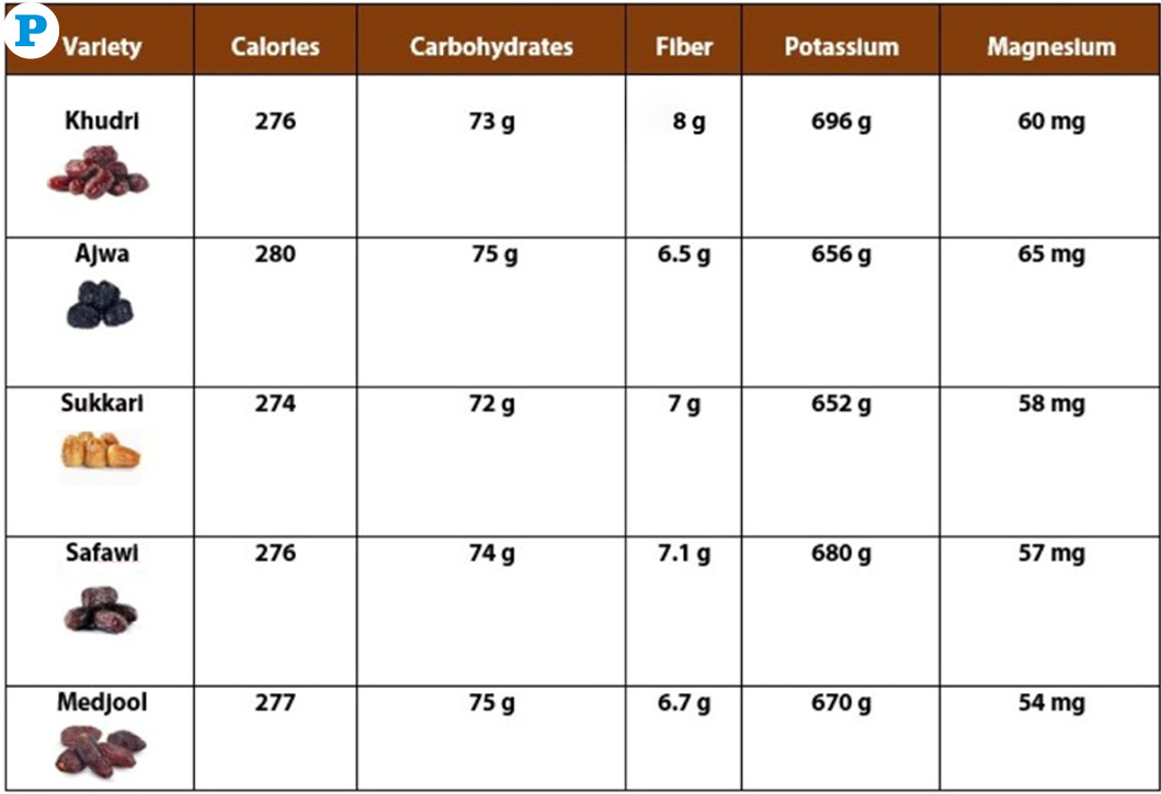 Ajwa Dates: 280 calories, 75g carbohydrates, 6.5g fiber, 652mg potassium, 65mg magnesium.