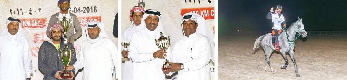 The owner of Sur (Mabrouk), ridden by Matar Saeed Mohammed Al Kaabi of Dukhan Endurance team which won the 100km seniors event, receives the winner’s trophy from Hamad bin M Khayareen during the presentation ceremony of the Endurance Ride, organised by the Qatar Endurance Committee yesterday. CENTRE: Owner of the winning horse in the 80km event, Jassin Hilal Hussain Abuhadoud receives the winner’s trophy. RIGHT: Abdulla Hozam Mohammed Al Marri, winner of the 80km Novice Ride, astride Utsunomya De Kerpont crosses the finish line.