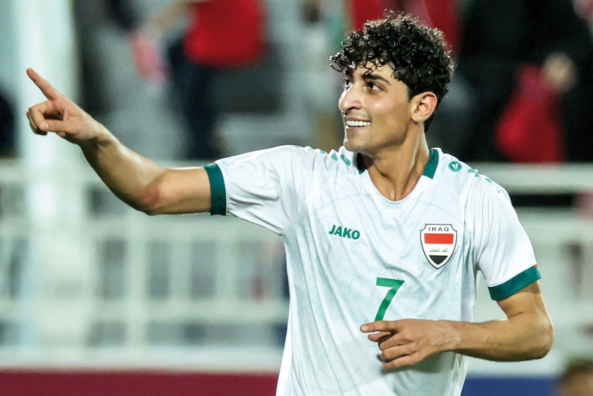 Iraq’s forward Ali Jasim celebrates after scoring a goal.