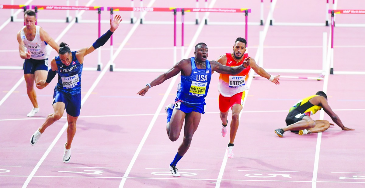 Team USA’s Grant Holloway grabbed a gold medal on his world championships debut, in what was a night of heartbreak for defending champion Omar McLeod at the Khalifa International Stadium.