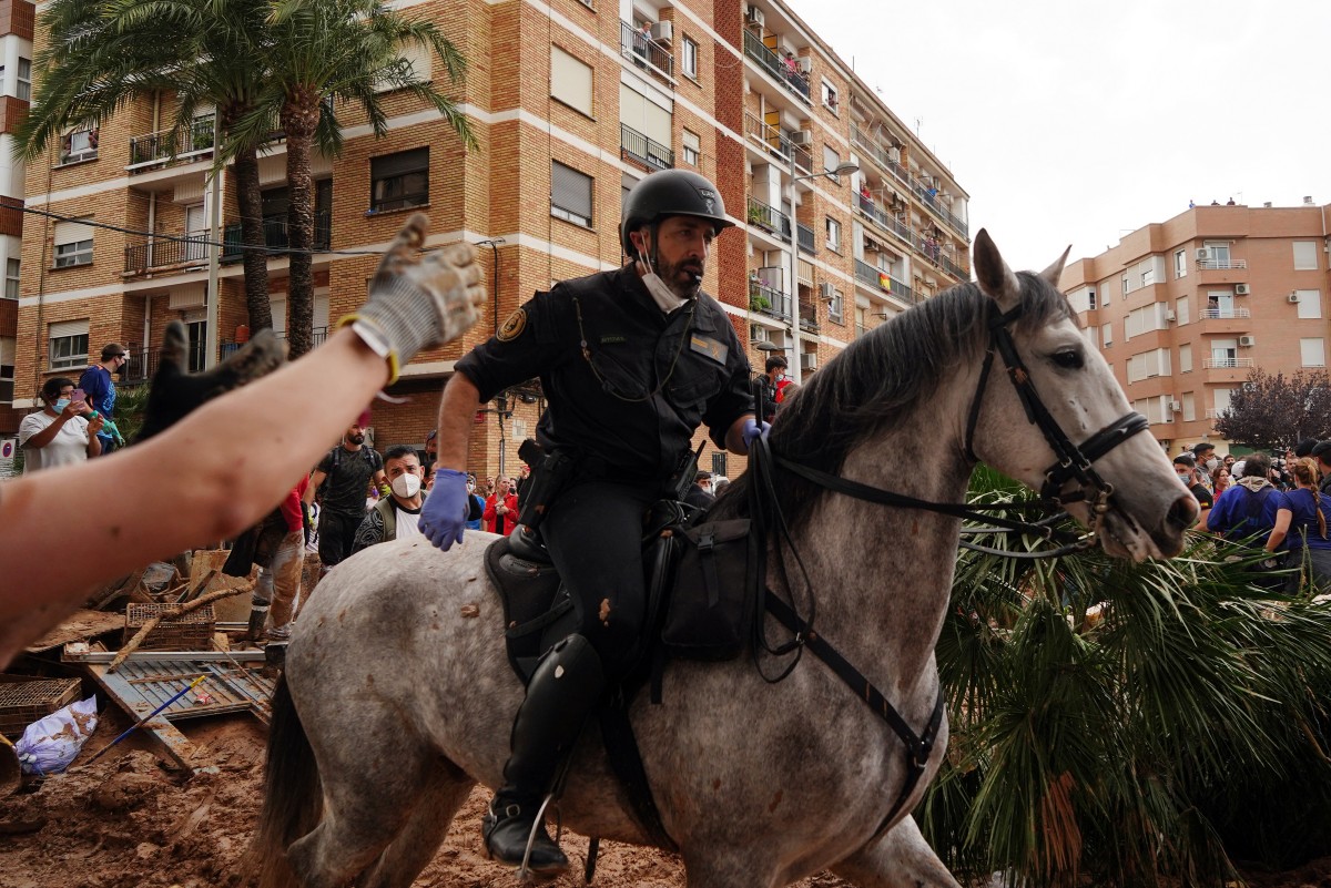 A police officer rides a horse as residents of Paiporta react to King Felipe VI of Spain's visit to this town, in the region of Valencia, eastern Spain, on November 3, 2024. Photo by Manaure Quintero / AFP.