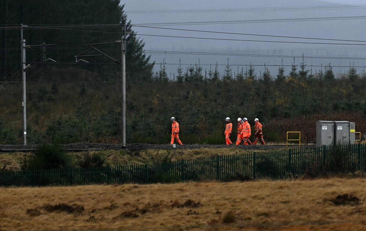 Network rail engineers walk along the track near to where an Avanti West Coast train, travelling from Glasgow to London Euston sation, derailed, near Shap, north west England on November 3, 2025. Photo by Paul ELLIS / AFP