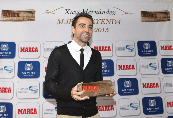 Barcelona legend and Al Sadd captain Xavi Hernández after receiving the Marca Leyenda Award at a special ceremony organised at Aspire Academy in Doha yesterday. Qatar Football Association Secretary General Mansoor Al Ansari joined a host of others at the ceremony.