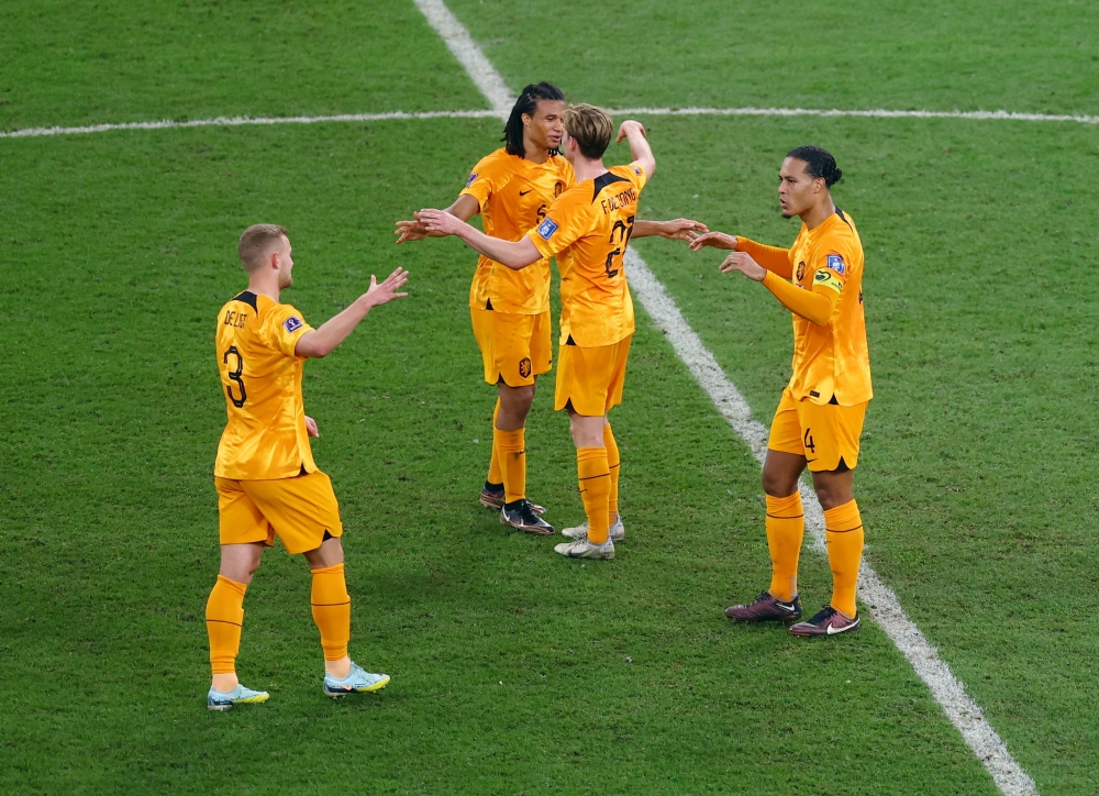 Netherlands' Virgil van Dijk, Matthijs de Ligt, Frenkie de Jong and Nathan Ake celebrates progressing to the quarter finals of FIFA World Cup Qatar 2022 at the Khalifa International Stadium, Doha, Qatar, on December 3, 2022 REUTERS/Lee Smith.