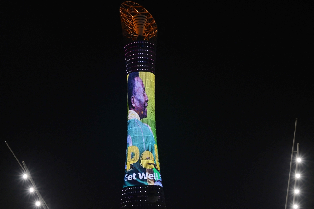 A picture taken on December 3, 2022, in Doha, during the Qatar 2022 World Cup football tournament, shows the Torch tower of Doha also known as the Aspire Tower, lit by a screen depicting Brazilian star Pele and reading a message in support to the former Brazilian football player who is being treated for a "respiratory infection" at the hospital in Sao Paulo. (Photo by NELSON ALMEIDA / AFP)