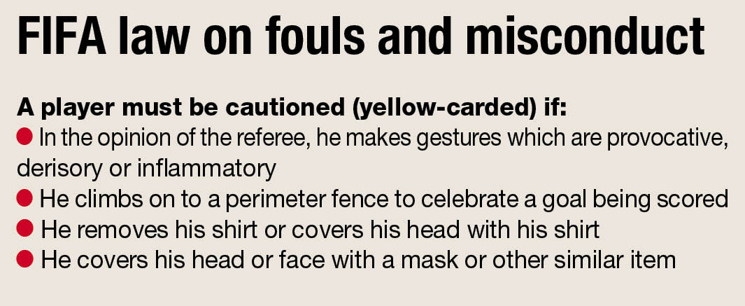 “While it is permissible for a player to demonstrate his joy when a goal has been scored, the celebration must not be excessive,” it states.