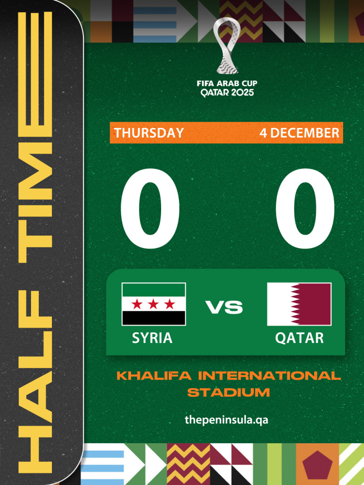 50' Syria’s goalkeeper saves a strong attempt from Qatar’s Edmilson
