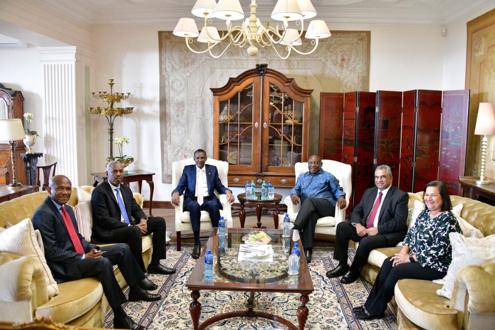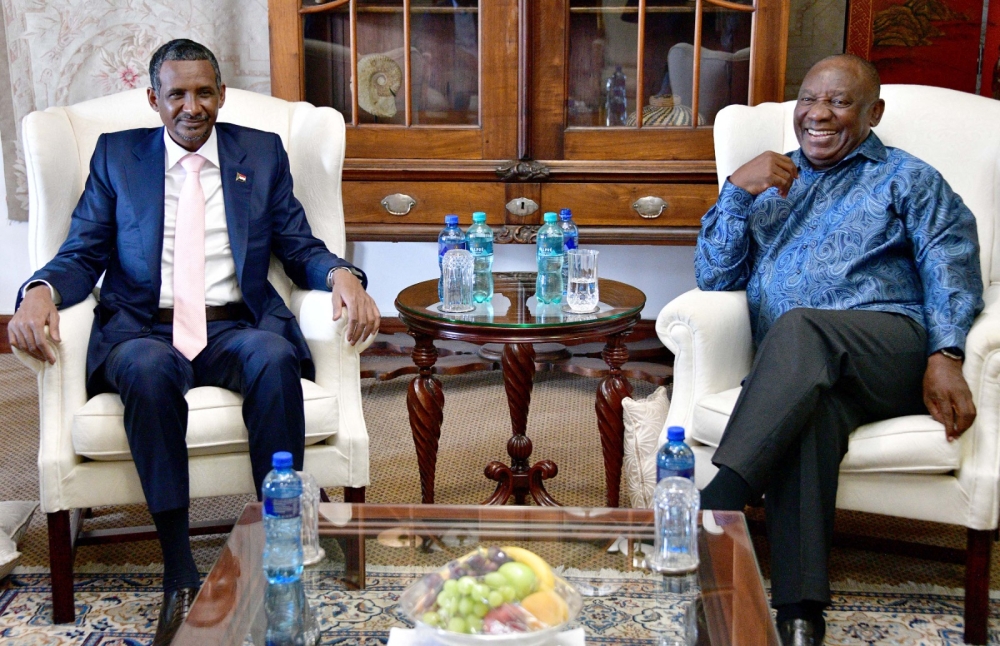 This handout photograph taken and distributed by South Africa's Government Communication And Information System (GCIS) on January 4, 2024 shows the leader of Sudan's paramilitary Rapid Support Forces (RSF) Mohamed Daglo (CL) on a visit to South African President Cyril Ramaphosa (CR) at his official residence in Pretoria. (Photo by GCIS / AFP)