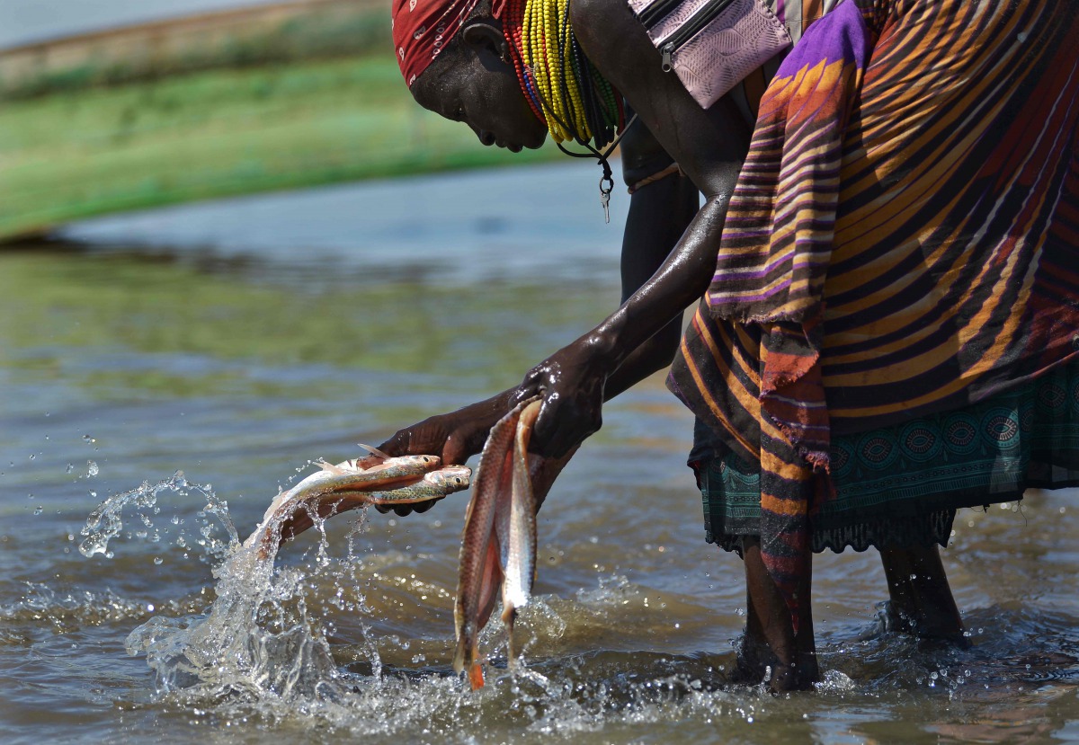 Armed fishermen from Kenya's Turkana county return from a fishing expedition aboard a boat on March 24, 2017 near Lowarengak, on the western shores of Lake Turkana, northern Kenya. Lake Turkana has gradually receded in recent years leading to diminished f