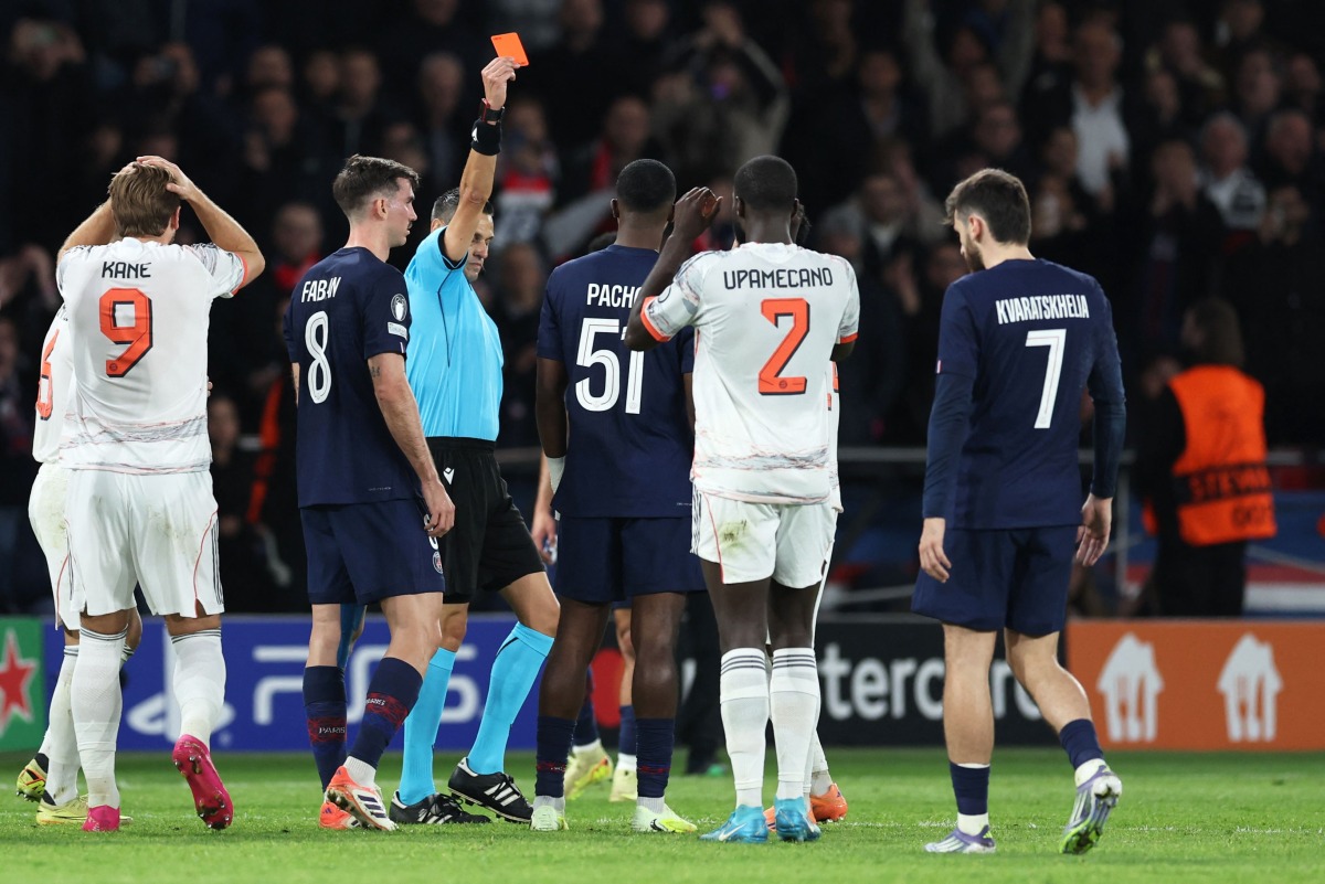 Italian referee Maurizio Mariani (C) shows a red card to Bayern Munich's Colombian forward #14 Luis Diaz (unseen) during the UEFA Champions League, league phase day 4, football match between Paris Saint-Germain (PSG) and FC Bayern Munich at the Parc des Princes in Paris, on November 4, 2025. (Photo by Thomas SAMSON / AFP)