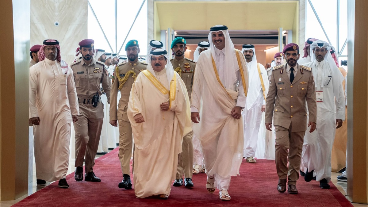 Doha, Qatar: The Amir HH the Amir Sheikh Tamim bin Hamad Al-Thani led the well-wishers to welcome his brother HM King Hamad bin Isa Al Khalifa of the Kingdom of Bahrain upon his arrival at Hamad International Airport (HIA) Amiri Terminal to preside over the delegation of the Kingdom of Bahrain to the 44th Summit of the Gulf Cooperation Council (GCC) Supreme Council, which Doha hosts Tuesday.