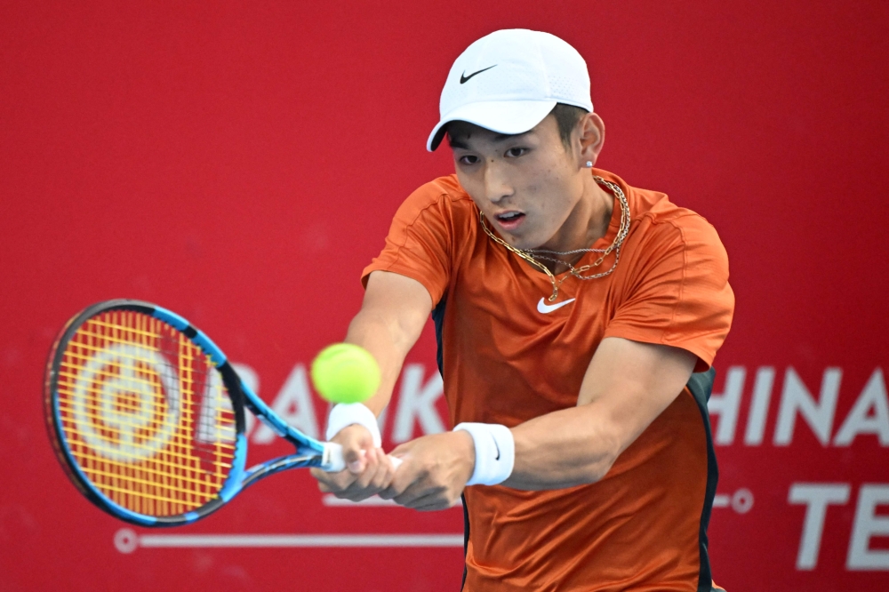 China's Shang Juncheng hits a return to Russia's Andrey Rublev during their men's semi-final singles tennis match at the Hong Kong Open in Hong Kong on January 6, 2024. (Photo by Peter Parks/ AFP)