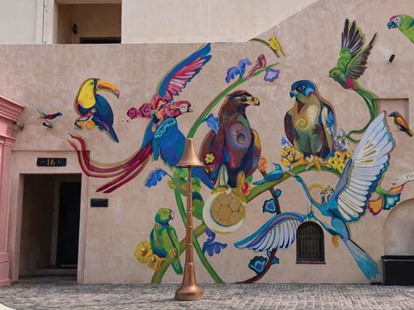 Adding a burst of colour and movement is “The Birds’ Game Mural” on Building 16 by Mexican artist Eva Bercamontes. Vibrant parrots, falcons and other exotic birds soar across the wall in a lively dialogue of Mexican motifs and Qatari elements. Created as part of the Year of Culture, the piece symbolises harmony, mutual respect and the beauty of cultural exchange between Mexico and Qatar.