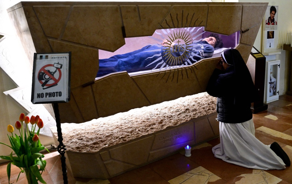 A nun prays at the tomb of Blessed Carlo Acutis, an adolescent who spent his life spreading his faith online, earning the moniker "God's Influencer", in the Shrine of the Renunciation in Assisi, part of the Church of Saint Mary Major, on April 3, 2025. Photo by Tiziana FABI / AFP