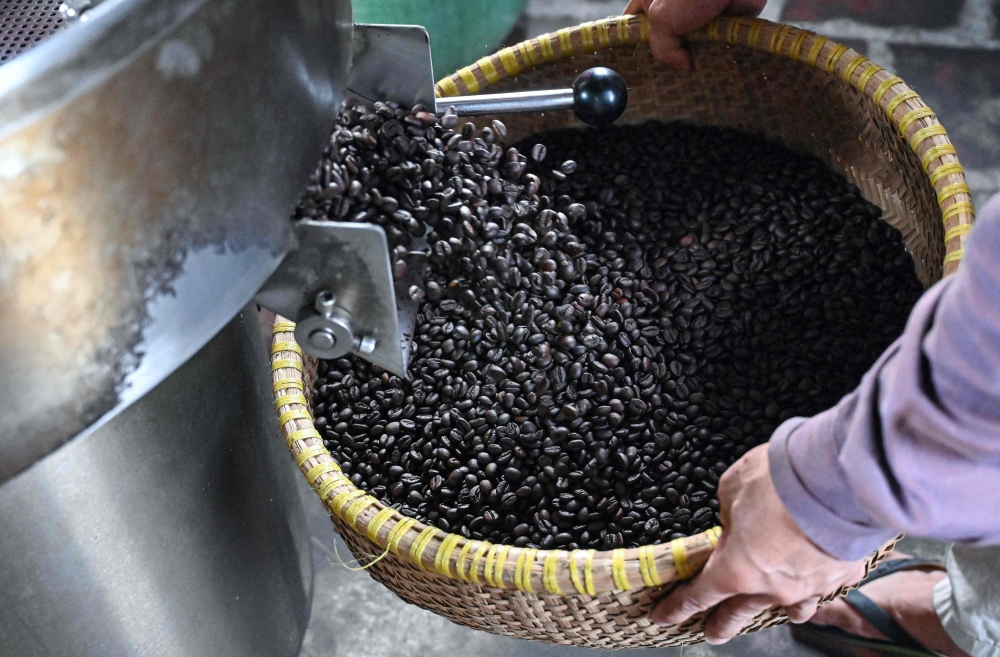 This photo taken on August 21, 2024 shows a worker picking up coffee beans after they are roasted at Thai Cafe's production facility in Hanoi. Photo by Nhac NGUYEN / AFP