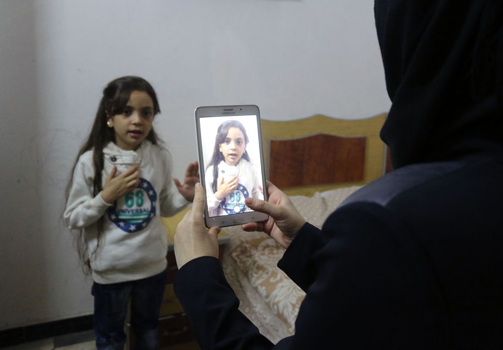 Syrian Bana al-Abed, who with the help of her mother had been posting heartrending tweets in English on life in the besieged eastern districts of Syria's Aleppo, uses a smart-phone to check her Twitter account in her home in east Aleppo, on October 12, 20