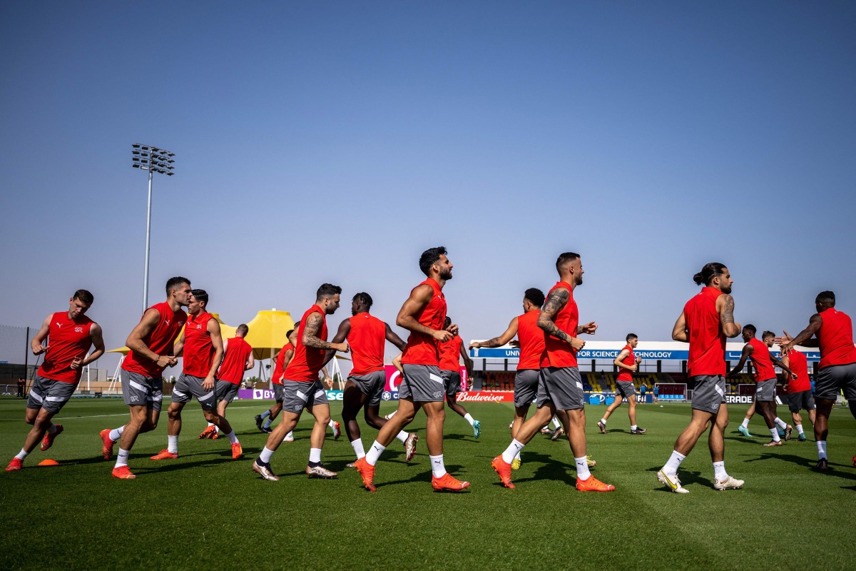 Switzerland’s players take part in a training session at the University of Doha. AFP