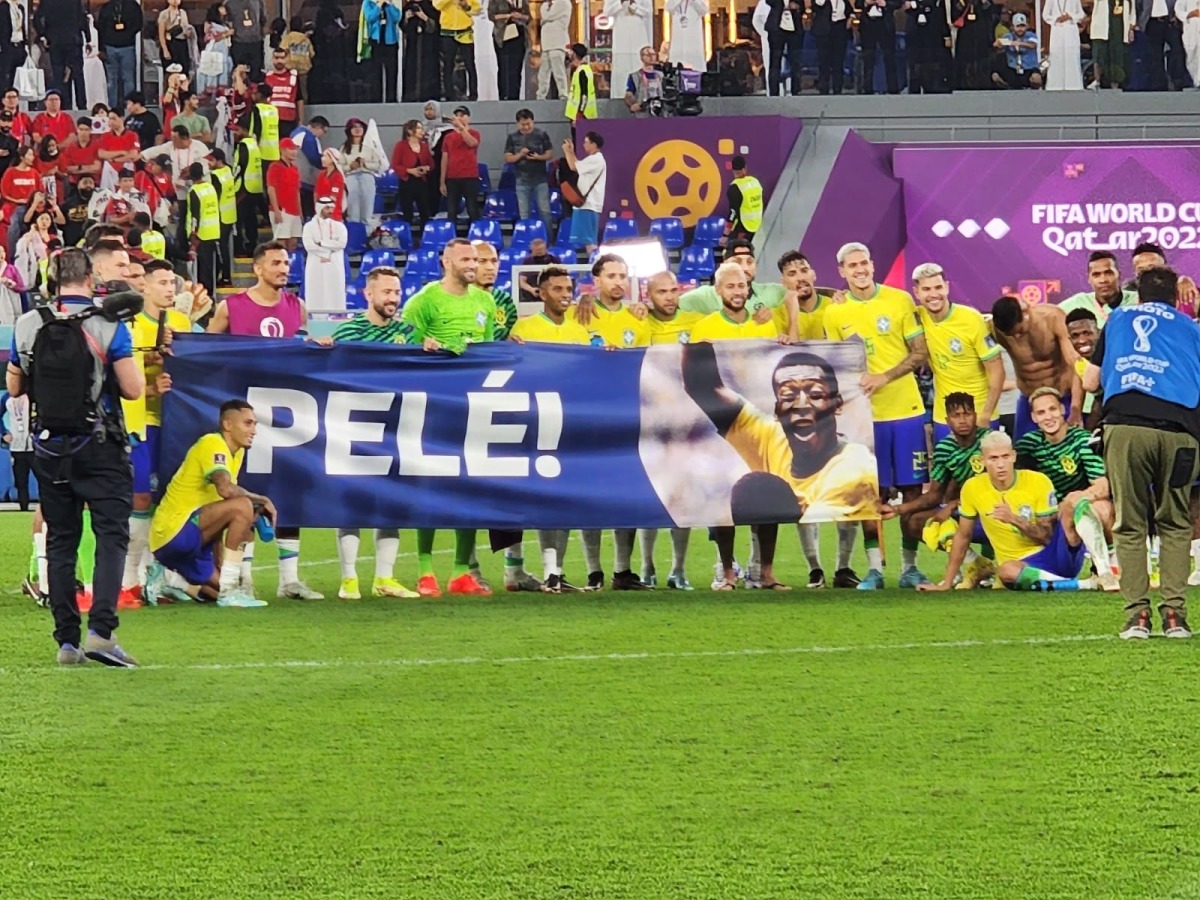 Brazil players pose for photo behind a large banner of Pele after their FIFA World Cup Qatar 2022 Round of 16 win over South Korea at the Stadium 974 in Doha on December 5, 2022. Photo: Abdul Basit / The Peninsula