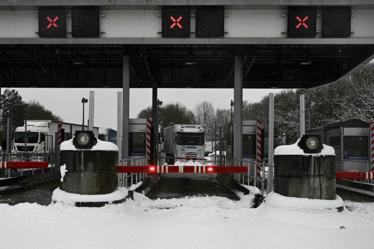 This photograph shows trucks transporting goods queuing to access the A10 motorway at the toll plaza near Saintes, western France, on January 7, 2026, following snowfalls. Photo: Philippe Lopez/ AFP