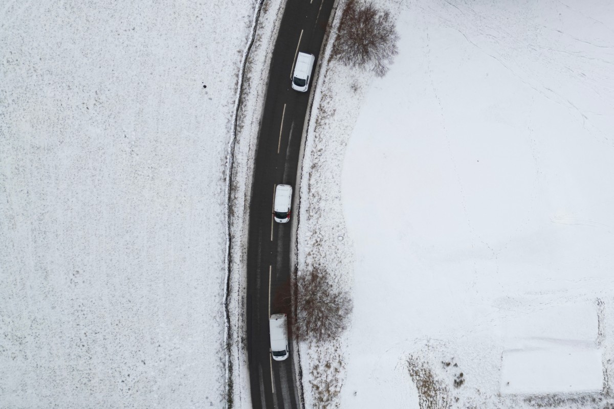 An aerial view of a vans travelling along Snake Pass road near the town of Glossop, Derbyshire, northern England on January 6, 2026, after a light snow covered the region overnight. Photo by OLI SCARFF / AFP