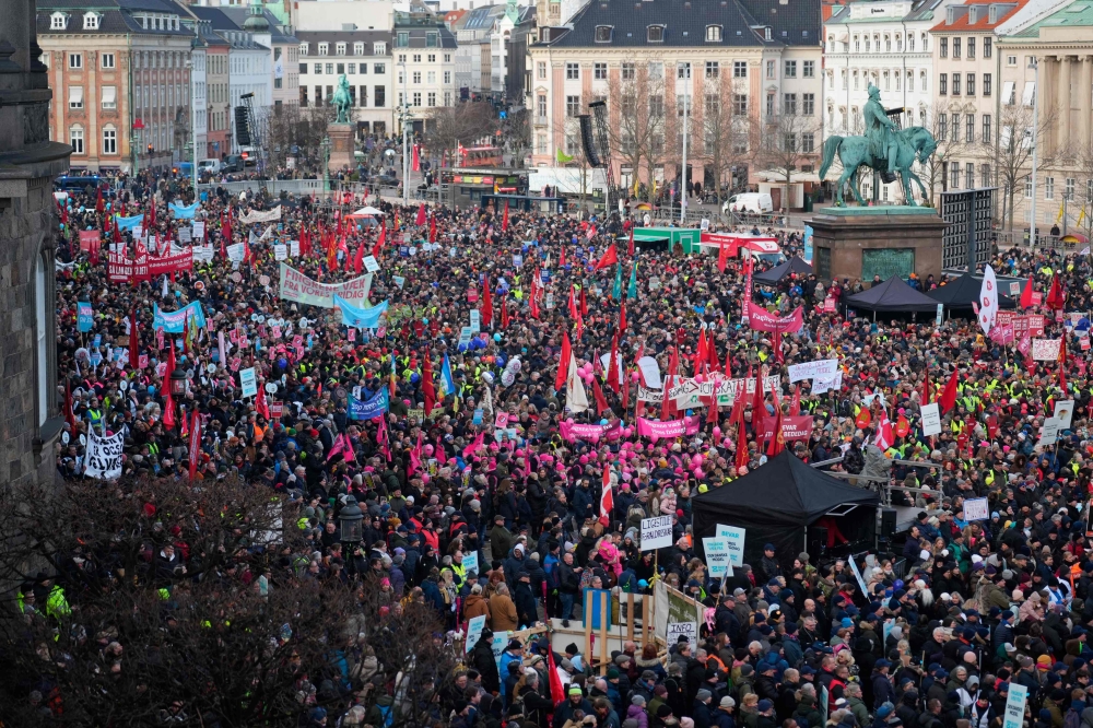 Protesters gather on Christiansborg Square in front of the Danish Parliament in Copenhagen, Denmark, during a demonstration on February 5, 2023. (Photo by Emil Helms / Ritzau Scanpix / AFP)