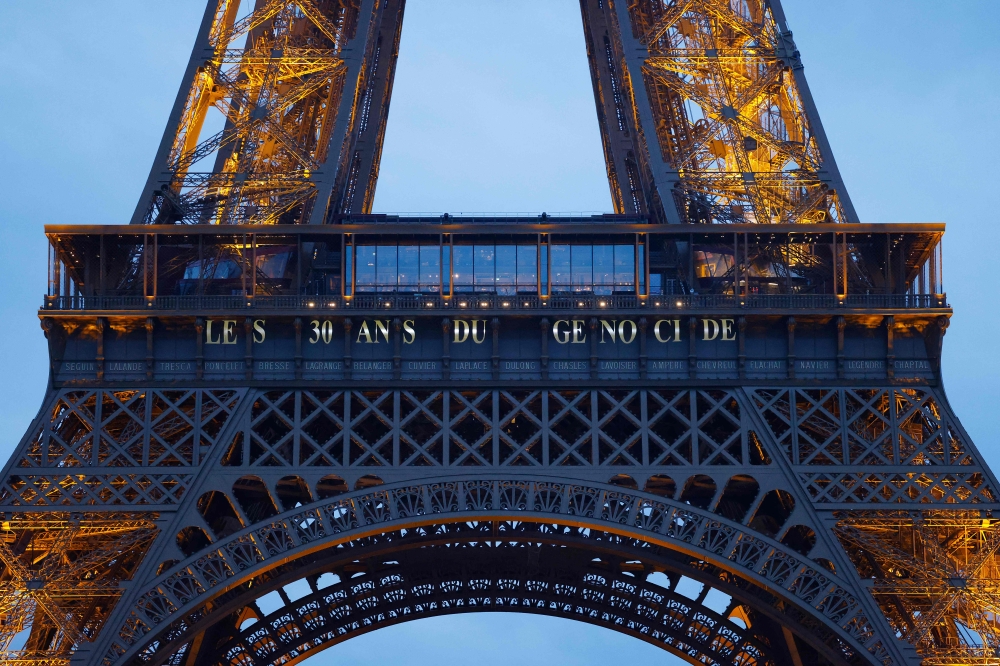 The Eiffel Tower displays in Paris on April 7, 2024, illuminated letters which read as 'The 30 years of the Genocide', as part of the commemorations of the 30th Anniversary of the 1994 Rwandan genocide. (Photo by Ludovic MARIN / AFP)