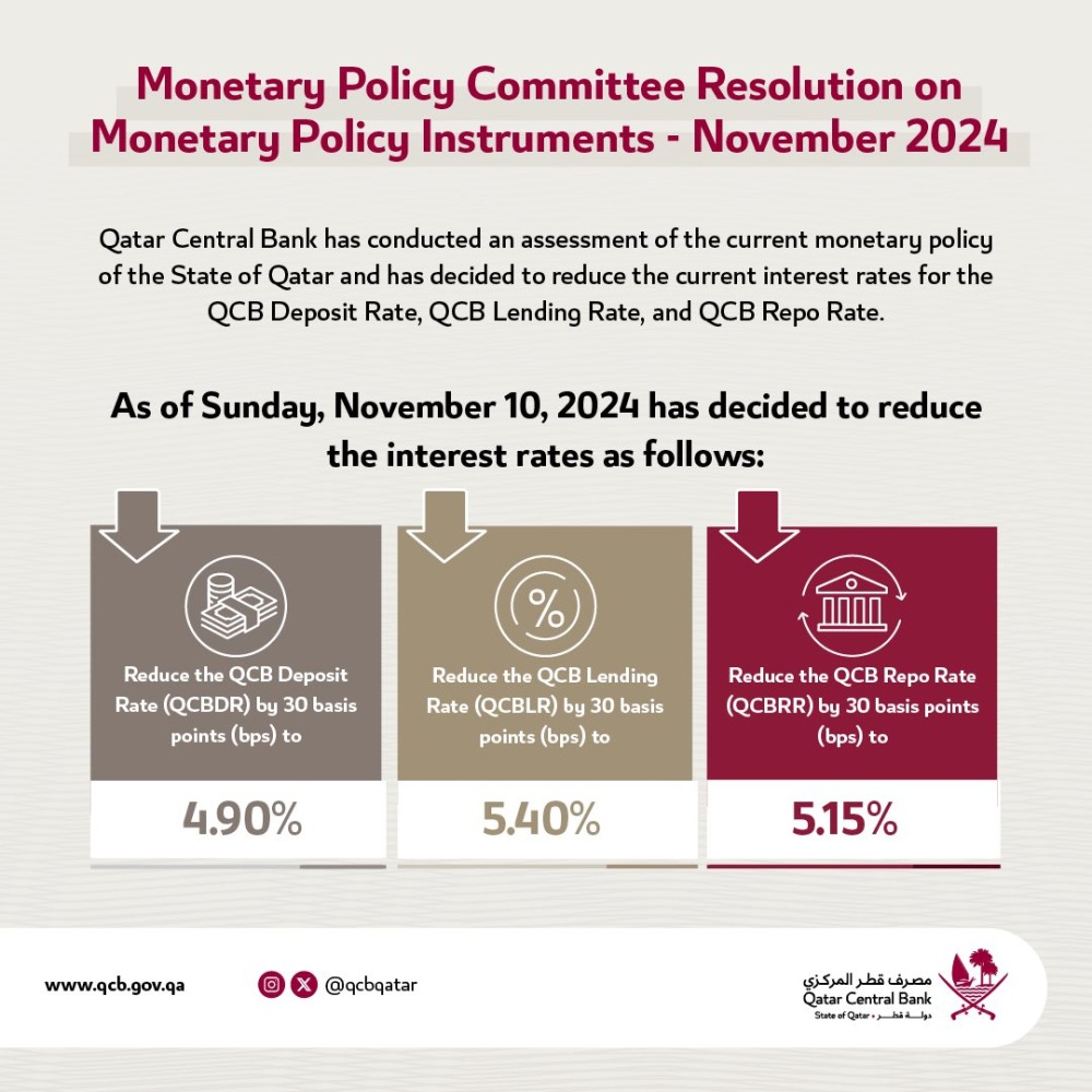 The bank explained in a post on its official account on Platform X that, in accordance with the Monetary Policy Committee's decision regarding monetary policy tools, Qatar Central Bank has evaluated the current monetary policy of Qatar and decided to lower the current interest rates related to the deposit rate, lending rate, and repo rate, effective from Sunday, Nov. 10.