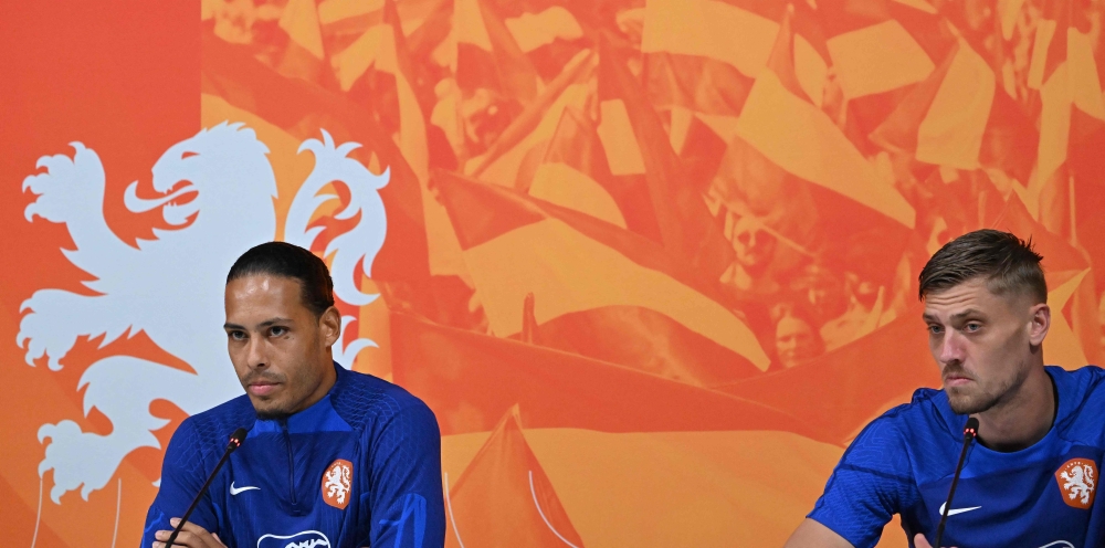 Netherlands' defender Virgil van Dijk (left) and goalkeeper Andries Noppert give a press conference at the Qatar University Training Site 6 in Doha on December 7, 2022, during the Qatar 2022 World Cup football tournament. - Netherlands and Argentina will meet in one of the Qatar 2022 World Cup quarter-finals on December 9. (Photo by Alberto PIZZOLI / AFP)