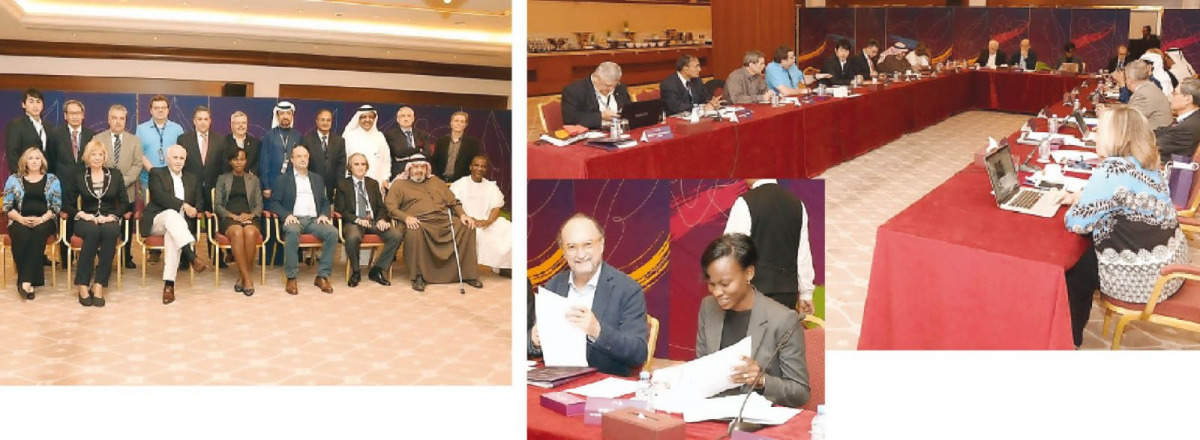The International Sports Press Association (AIPS) Executive Committee members pose for a photograph on the opening day of the 79th AIPS Congress in Doha yesterday. The Congress will conclude on Thursday. Picture by: Adham Elkawas TOP: The Executive Committee Meeting of the 79th AIPS Congress in progress at the Sheraton Hotel in Doha, yesterday. AT LEFT: AIPS President Gianni Merlo (left) and Interim Secretary General Evelyn Watta during the Executive Committee Meeting at the 79th AIPS Congress in Doha yesterday.