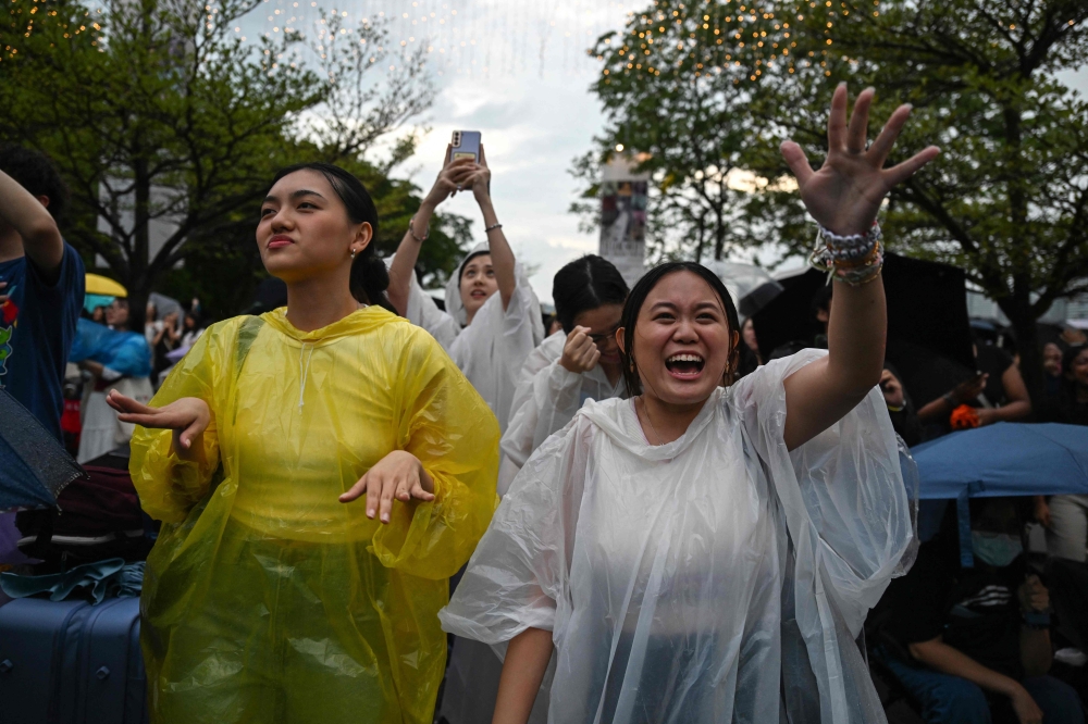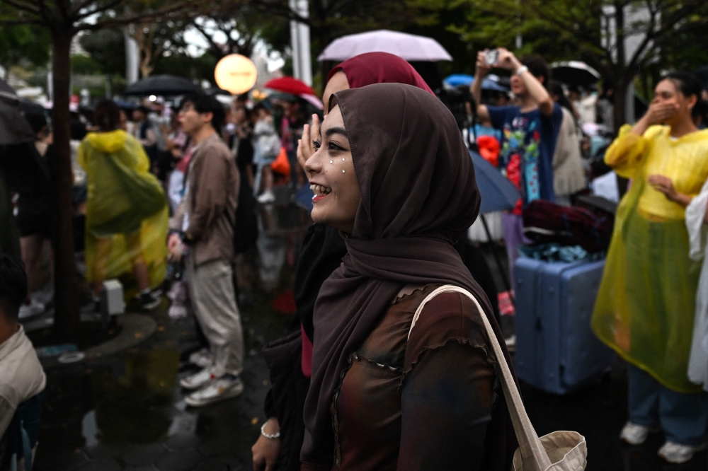 Fans of US singer Taylor Swift, also known as Swifties, react during the pop star's Eras Tour concert as they listen to the performance from outside the National Stadium in Singapore on March 7, 2024. (Photo by Mohd RASFAN / AFP)