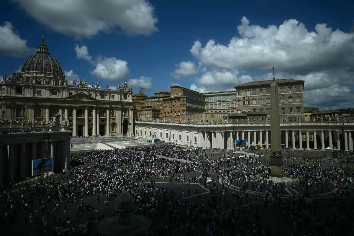 People stand on St Peter's Square after black smoke billowed from a chimney over the Sistine Chapel, on the second day of the conclave, in the Vatican on May 8, 2025. Photo by Dimitar DILKOFF / AFP