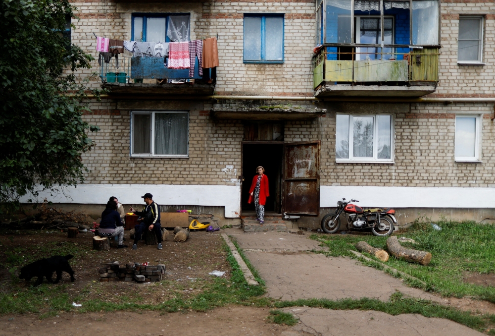 People sit outside their house in Niu York (New York) near Toretsk, a war-affected area in eastern Ukraine, as Russia's attack in Ukraine continues, Donetsk region, Ukraine, September 8, 2022. (REUTERS/Ammar Awad)
