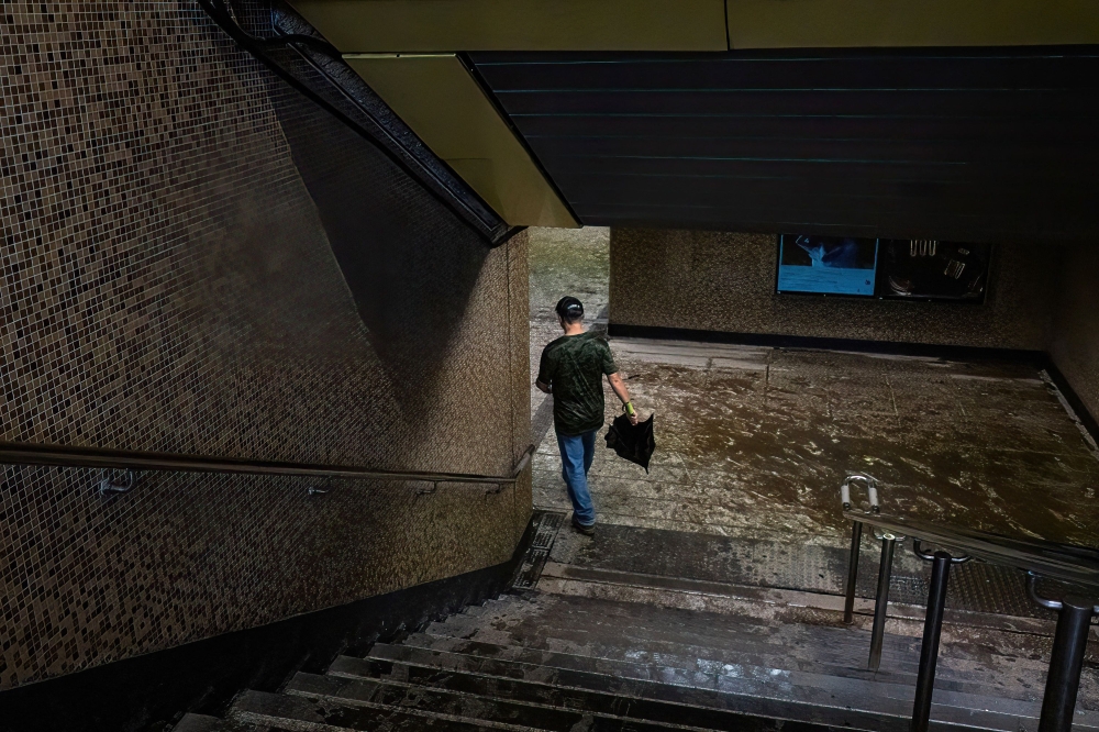 A man walks through mud in the Wong Tai Sin MTR station in Hong Kong on September 8, 2023, following major flooding. Photo by Bertha WANG / AFP​​​​​​​