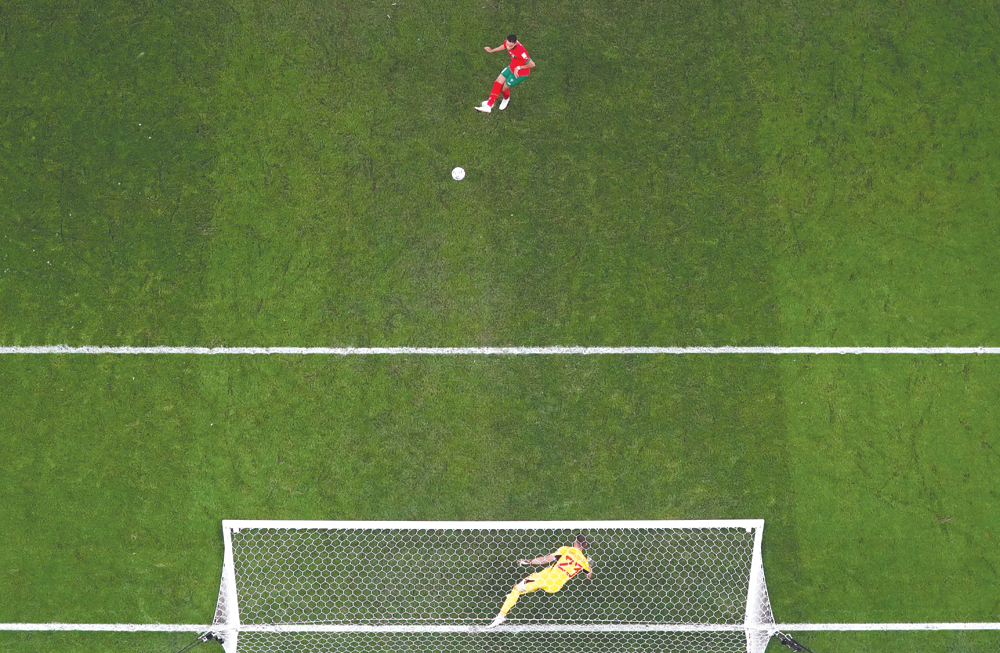 Morocco’s Abdelhamid Sabiri beats Spain goalkeeper Unai Simón during their penalty shootout on Tuesday. REUTERS