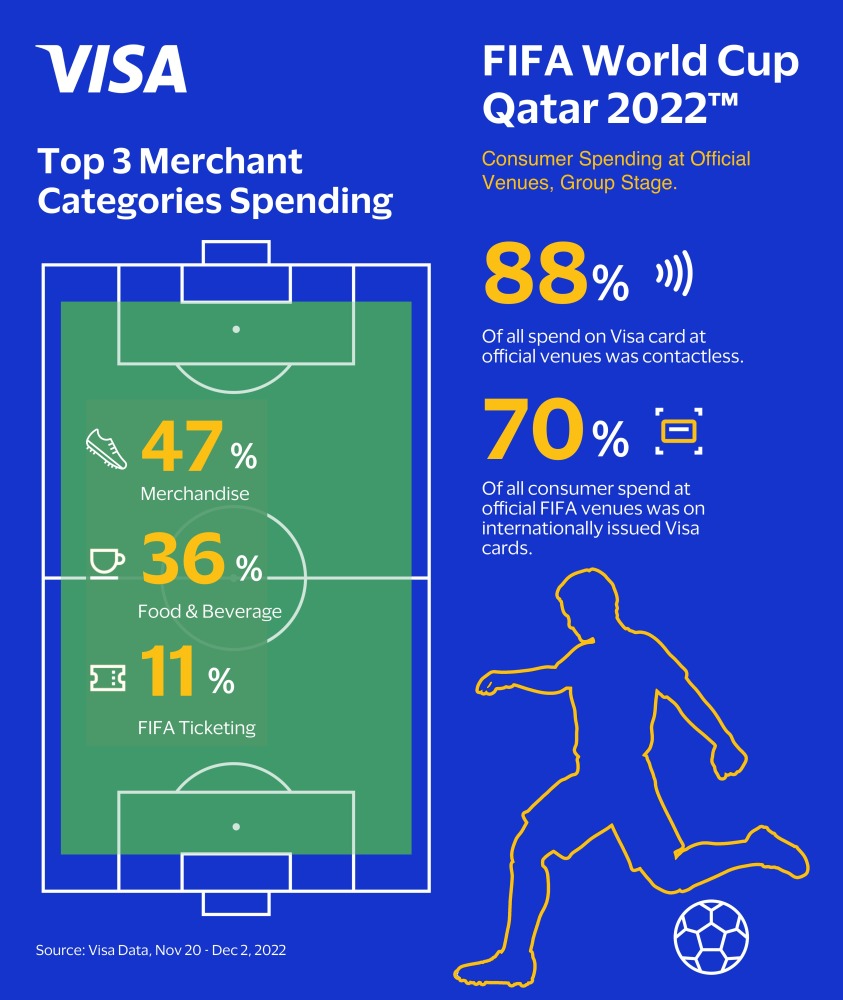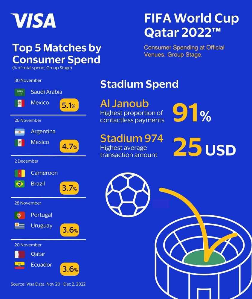 Doha: Visa, the Official Payment Technology Partner of FIFA, on Thursday released spend data on Visa cards for all official FIFA World Cup venues from the start of tournament through group matches stage on December 2.