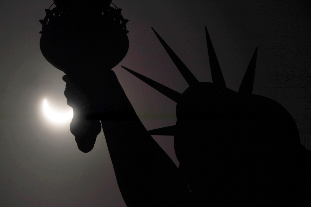 A partial solar eclipse moves across the sky near the Crown of the Statue of Liberty on Liberty Island on April 8, 2024, in New York City. (Photo by TIMOTHY A. CLARY / AFP)