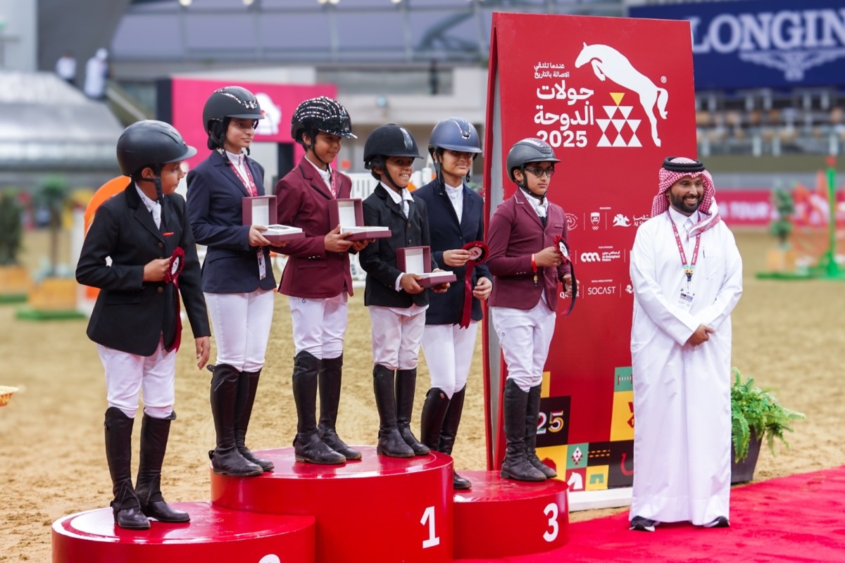 Future riders 60cm class podium finishers Nasser Hamd Al Thani, Asmaa Ahmad Al Sulaiti, Salman Faisal Al Marri, Shaikha Mohamed Al Thani, Khalifa Joaan Al Thani, Mohammed Saleh Al Fadala were honoured by Doha Tour Event Director Mohammed Jaber Al Khayarin.