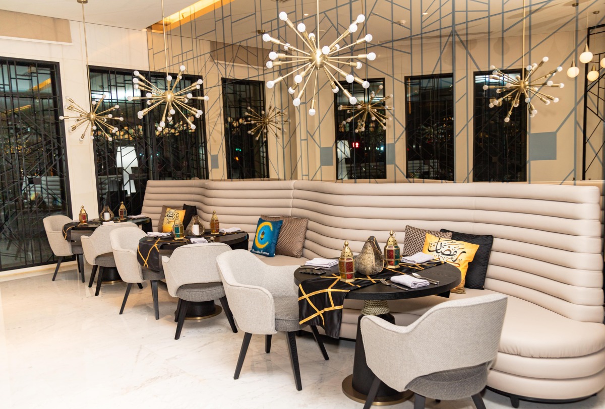 The bāzār restaurant, adorned with traditional lanterns and oriental patterns, exudes the festive spirit of Ramadan, while the outdoor terrace offers a serene setting to enjoy the pleasant Doha winter.