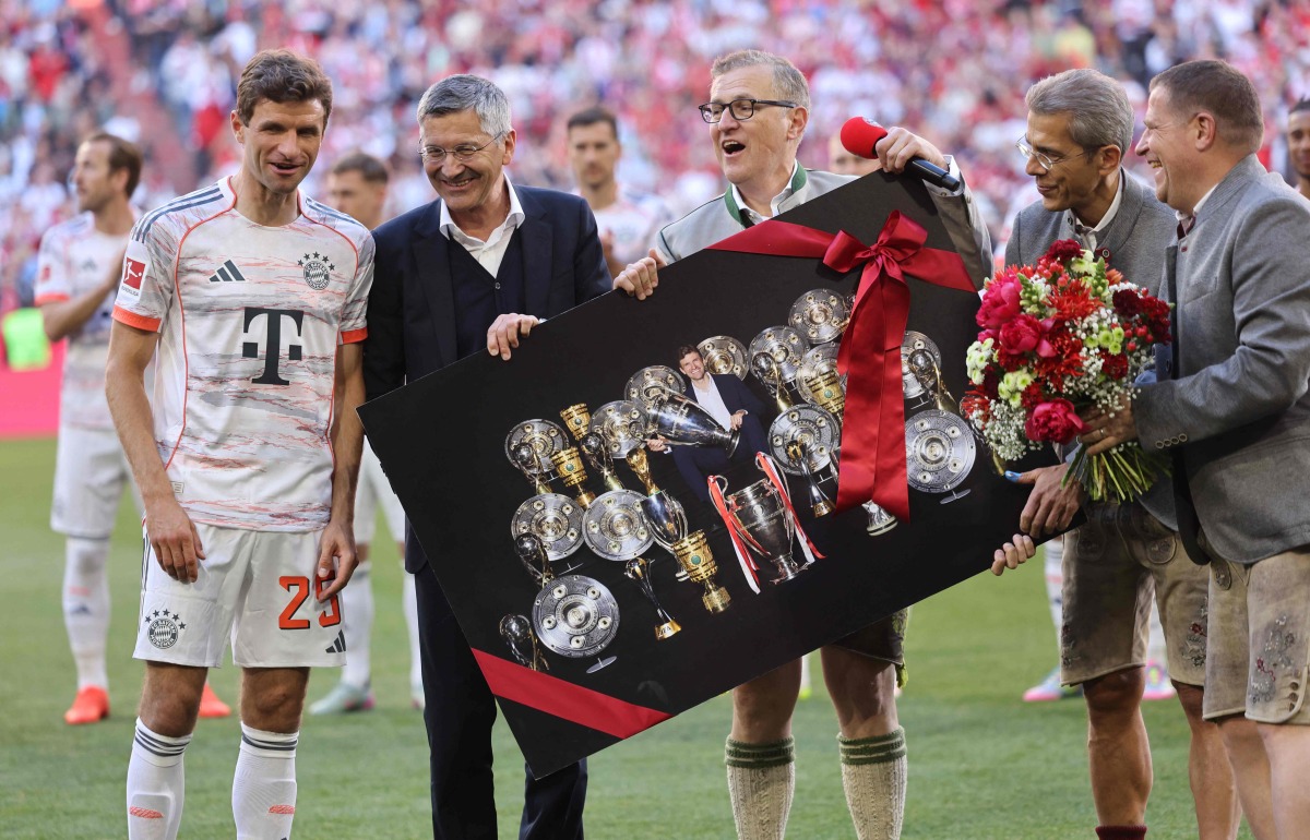 Bayern Munich's German forward #25 Thomas Mueller (L) is handed by Bayern Munich's President Herbert Hainer a picture showing Muller inmid trophies ahead the German first division Bundesliga football match between Bayern Munich and Borussia Moenchengladbach in Munich on May 10, 2025. (Photo by Alexandra BEIER / AFP)